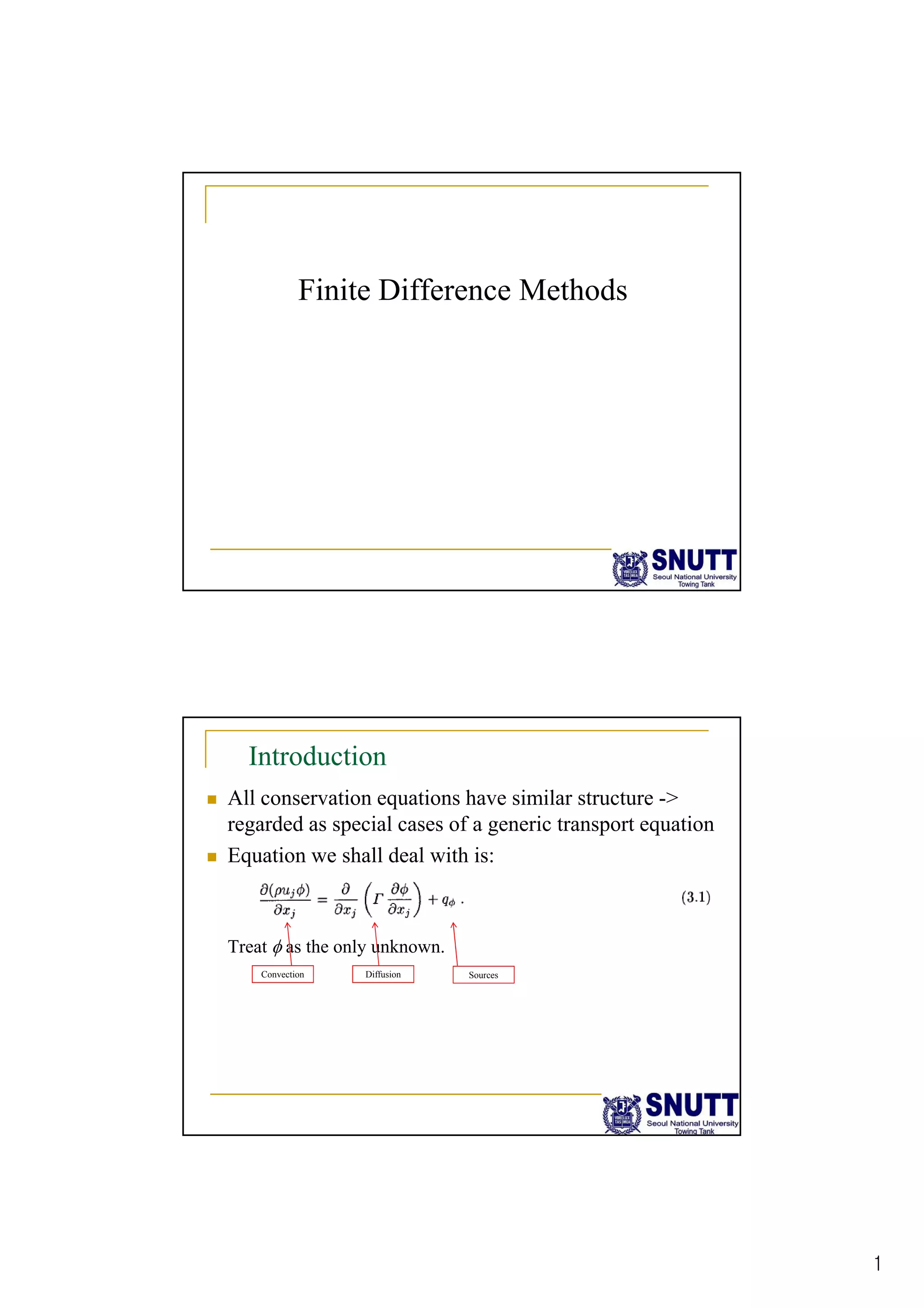 Finite difference methods discretize the domain into a grid and approximate derivatives as algebraic equations relating variable values at neighboring grid points. First and second derivatives can be approximated using forward, backward, or central differencing schemes of varying orders of accuracy. Boundary conditions require special treatment as higher-order approximations may require values outside the domain. Solving the resulting system of algebraic equations provides an approximate numerical solution to the partial differential equation over the discretized domain.