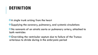 Truncus arteriosus is a rare congenital heart defect where a single arterial trunk arises from the heart to supply the pulmonary and systemic circulations. It occurs when the embryonic truncus arteriosus fails to divide into the aorta and pulmonary artery. Left untreated, it causes cyanosis and heart failure in newborns. Surgical repair is now possible to connect the pulmonary artery to the right ventricle, improving survival rates to over 80% at one year of age compared to just 15% for uncorrected patients.
