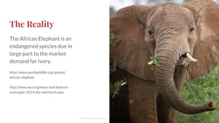 The document proposes the "Trunk Love" program to help raise awareness of the declining African elephant population. It involves two main elements: 1) Live and digital "trunk show" fashion events to bring together designers, retailers, and influencers. 2) Art installations featuring original elephant sculptures that would take over public spaces like parks and districts in various cities. The goal is to use the commercial power of the fashion industry to share the elephants' story in an emotional way through art and commerce in order to capture attention and support for conservation efforts. A digital exhibit and social media components are also discussed.