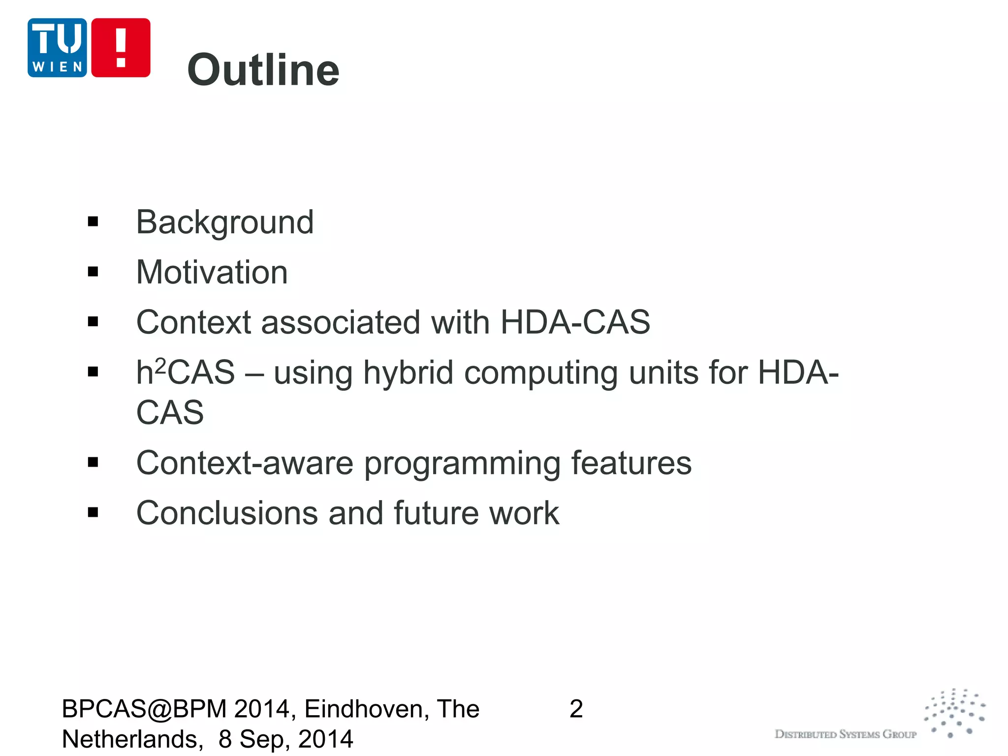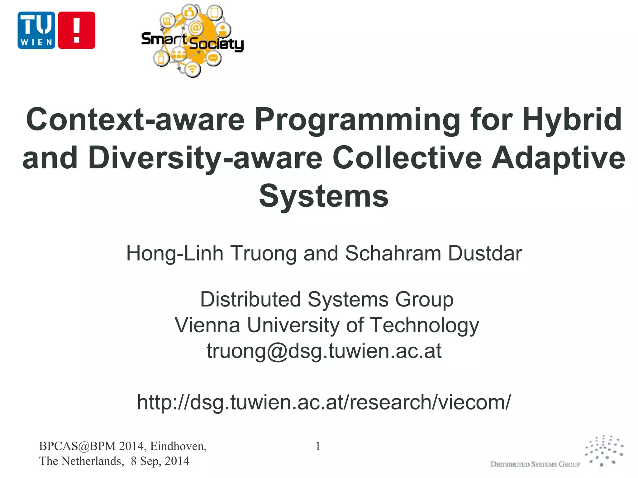 The document discusses context-aware programming for hybrid and diversity-aware collective adaptive systems (HDA-CAS) developed by Hong-Linh Truong and Schahram Dustdar. It outlines the motivation and background for HDA-CAS, emphasizing the importance of hybridity and elasticity in addressing complex problems through hybrid compute units. The authors propose strategies and tools for programming and managing HDA-CAS, highlighting the need for context understanding and the development of suitable programming constructs.