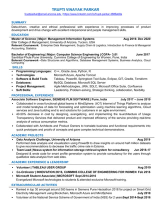 Trupti Parkar is a data-driven professional seeking a role utilizing her skills in data analysis, machine learning, and cloud technologies. She has a Master's in Management Information Systems and Bachelor's in Computer Science Engineering. Her experience includes collaborating on IoT platforms at Siemens and performing data analysis projects. She is proficient in programming languages, databases, and tools like Tableau and PowerBI.