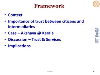This document discusses the role of trust between citizens and intermediaries in electronic governance programs. It uses the example of Akshaya, an e-governance program in Kerala, India. The program was successful due to factors like local intermediaries with ICT skills who were trusted within the community. However, intermediaries needed to be part of established institutions to be fully effective. The study found trust was highest for e-payments and entitlement services where intermediaries represented trusted government institutions, but lower for agricultural and health information services. Institutional membership and a multi-purpose role were important for intermediaries to build trust.
