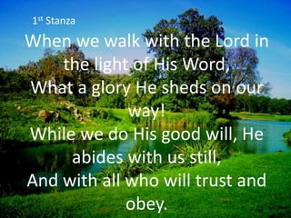 The document is a hymn about trusting and obeying God. It consists of 5 stanzas that each describe a benefit of trusting and obeying God, such as having burdens lifted, sorrows shared, and doubts removed. The chorus repeats after each stanza that the only way to be happy in Jesus is to trust and obey, as there is no other way.
