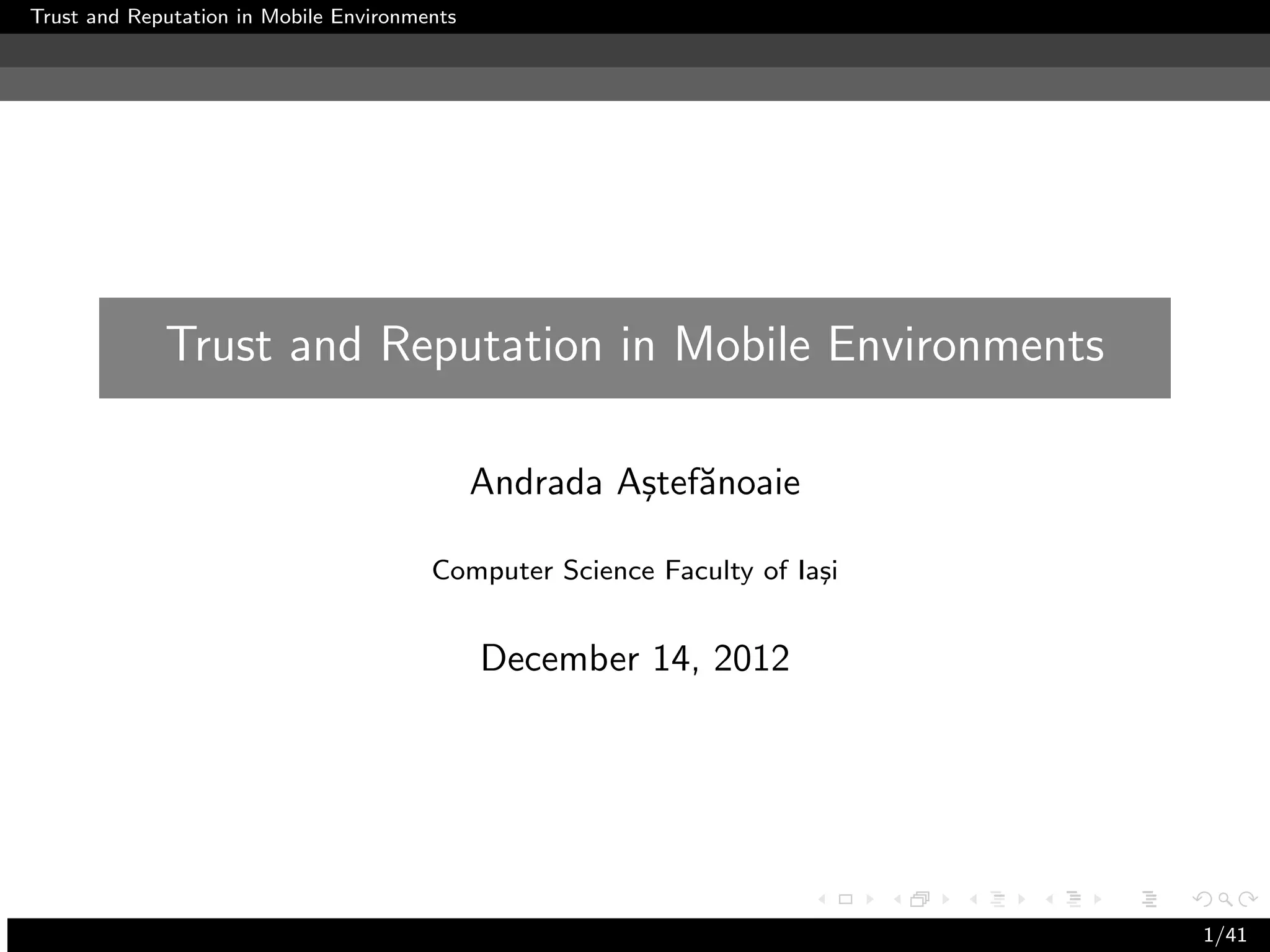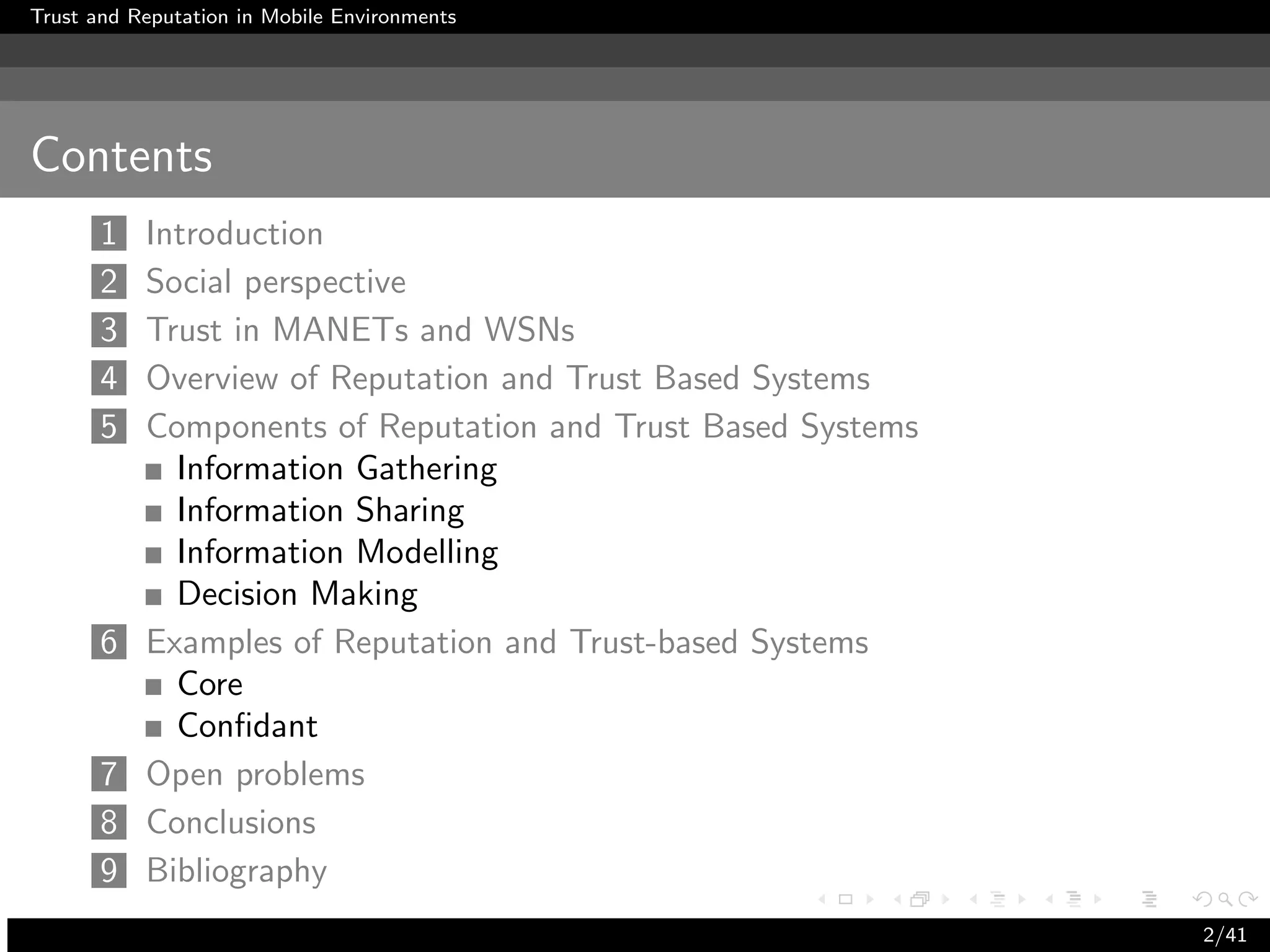 The document provides an overview of trust and reputation systems in mobile environments such as mobile ad hoc networks (MANETs) and wireless sensor networks (WSNs). It discusses how trust and reputation are modeled based on social concepts of reputation, trust beliefs, and information asymmetry. It also examines challenges like selfish and malicious behavior in MANETs and WSNs. The document then describes common components of reputation systems, including information gathering, sharing, modeling, and decision making. It provides examples of two reputation systems - Core and Confidant - and discusses their approaches to these components. Finally, it outlines some open problems and conclusions regarding trust and reputation systems.