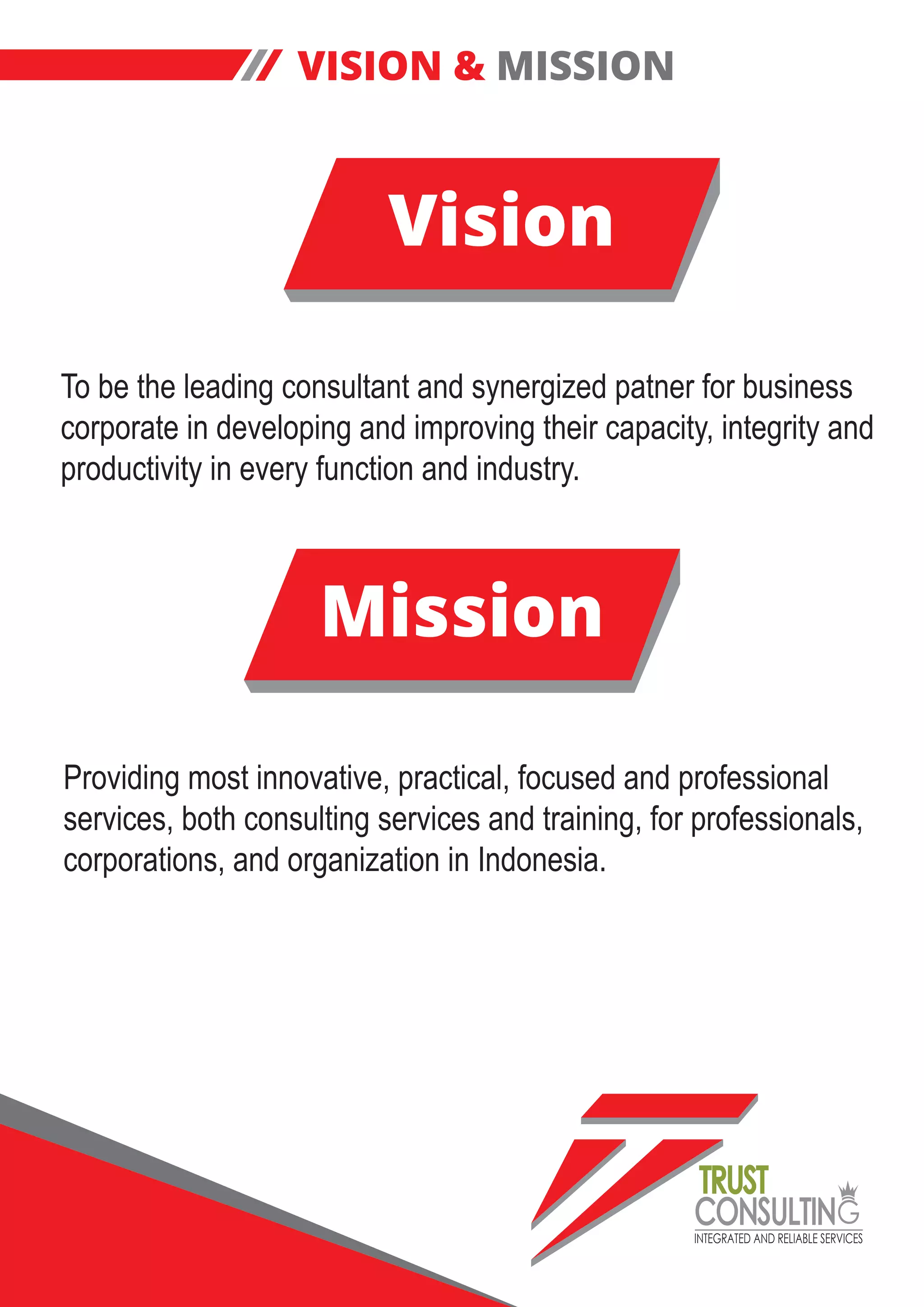 Trust Consulting is an integrated consulting firm based in Indonesia that provides services in consulting, human resources, marketing, communications, and events. It aims to be a leading partner for businesses in developing capacity and productivity. Services include consulting, training, graphic design, copywriting, and event production. The company was established in 2011 and has expanded its services over time to meet a variety of client needs.