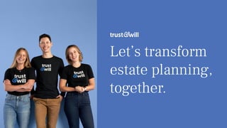 Trust & Will is a startup that aims to transform estate planning by making it simple, affordable and inclusive. It uses a data-driven and design-focused approach with a team across the US led by an experienced founding team. The document discusses Trust & Will's mission and values of supporting families, kindness, health, honesty and growth. It outlines the company's benefits such as medical, dental and vision insurance, paid time off, parental leave, life insurance and learning and development support to create a collaborative culture.