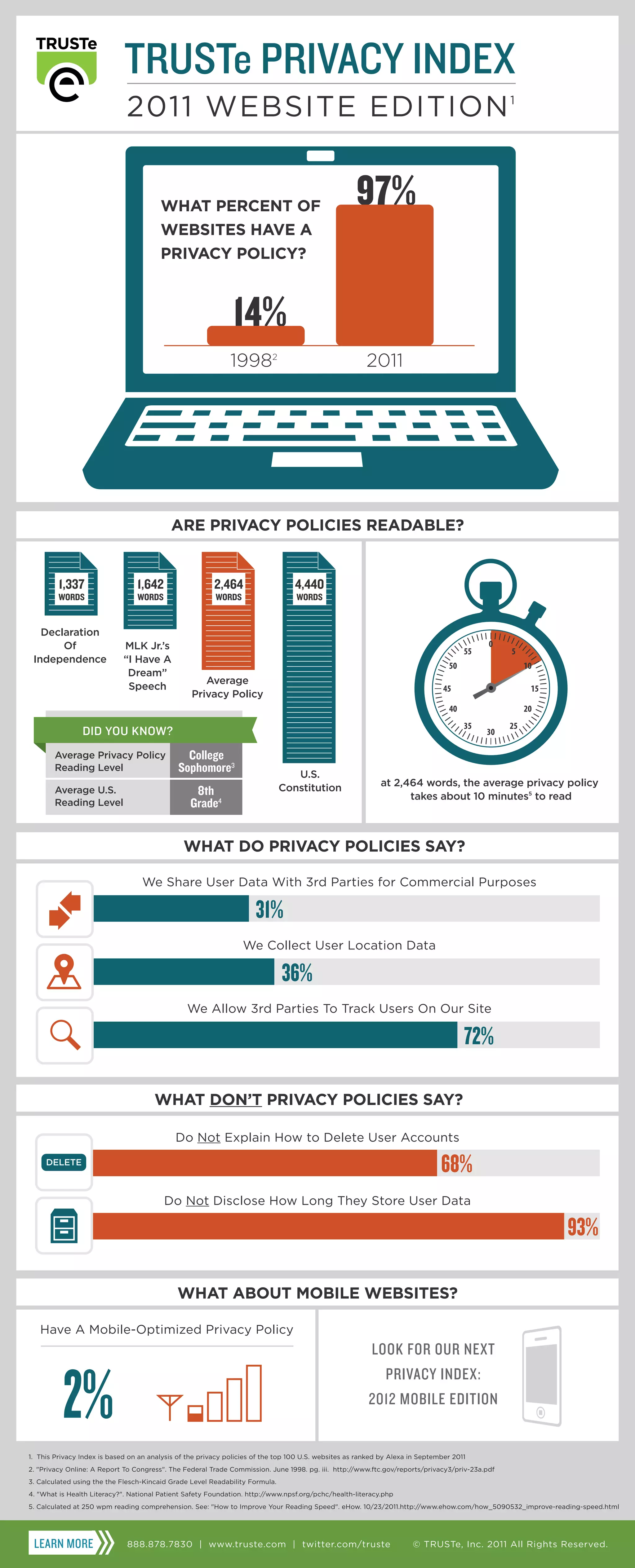 The document is a 2011 privacy index report from Truste that analyzes the privacy policies of the top 100 U.S. websites. Some key findings are that 97% of websites now have a privacy policy, but the average policy is at a sophomore college reading level and takes about 10 minutes to read. The report also found that most policies state that user data is shared with third parties and users' locations are collected, but few explain how to delete accounts or how long data is stored. Only 2% of websites had a mobile-optimized privacy policy.
