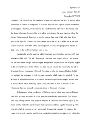 The document provides an analysis and summary of the film Rashomon by Akira Kurosawa. It discusses how the film presents four different versions of the same event from different perspectives. While the details of each account conflict, they agree that a samurai was killed and his wife was raped. The document analyzes why the characters may have lied or distorted the truth in their testimonies, and how this reflects the idea that absolute truth is impossible and truth is relative. It also discusses the debates between those who believe multiple truths can co-exist, like Roger Ebert, versus those who believe there is one absolute truth.