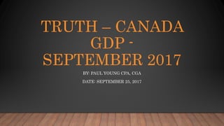 The document discusses Canada's GDP growth and critiques the performance of the Trudeau government compared to the Harper administration. It highlights issues such as slow economic growth, the impact of tax reforms, and the government's role in supporting economic policies while noting the consistency of GDP growth rates over the past 15 years. The document suggests that ongoing challenges, particularly in the goods-producing sector and housing market, remain significant concerns for the Canadian economy.