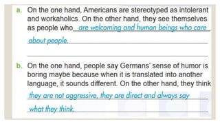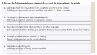 This document discusses stereotypes and labeling. It begins by explaining that people often make generalizations and comparisons based on their experiences, which can lead to stereotypes. Stereotypes are untrue assumptions about groups that overgeneralize their characteristics. While some generalizations may be necessary, stereotypes are dangerous as they can lead to wrongly judging individuals. The document advocates considering each person as an individual to avoid missing opportunities due to labels. It provides examples of common stereotypes and suggests reflecting more before judging people based on superficial attributes alone. Labeling can negatively impact people's self-perception and segregate society.