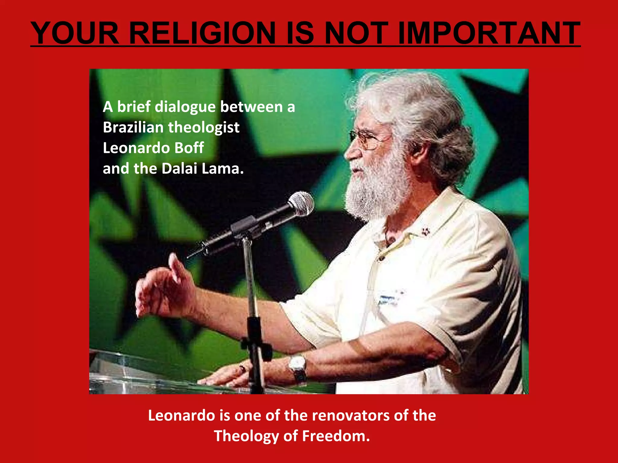 The Dalai Lama responds to a question from Leonardo Boff about what is the best religion by saying the best religion is the one that makes you a better person and brings you closer to God. When asked what makes a better person, the Dalai Lama says compassion, wisdom, detachment, love, humanitarianism, ethics, and responsibility. He tells Leonardo that he is not interested in his religion, but in how he behaves and the positive impact of his actions and thoughts on others.