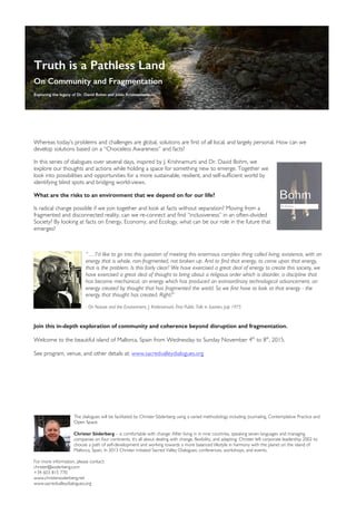 This document announces a series of dialogues taking place in Mallorca, Spain from November 4-8, 2015 that will explore developing solutions to today's global problems through a choiceless awareness and by looking at facts without separation. The dialogues will be inspired by the works of J. Krishnamurti and Dr. David Bohm and will examine opportunities for a more sustainable world by identifying blind spots and bridging perspectives. Participants will discuss what role they can play in shaping the future by considering facts around energy, the economy, and ecology. The dialogues will be facilitated using various methodologies including journaling, contemplative practice, and open space and aim to foster community and coherence beyond disruption and fragmentation.