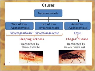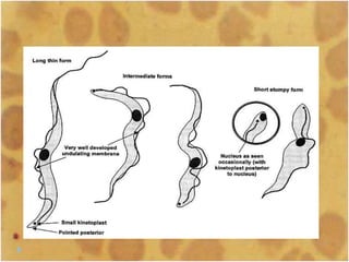 This document discusses the genus Trypanosoma, which are single-celled parasitic protozoa that cause serious diseases in humans and animals. It describes their morphology and life cycles. Trypanosoma have a single nucleus, flagellum, and rounded or leaf-like body. They exist in three main forms: amastigotes which are spherical, promastigotes which are elongated, and trypomastigotes which are found in the bloodstream. Examples mentioned are T. lewisi, T. equiperdum, T. brucei gambiense, and T. cruzi. Symptoms in humans are provided for the different stages of infection, such as headaches, fever, and