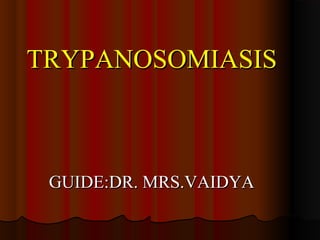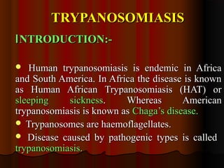 Trypanosomiasis is caused by pathogenic Trypanosoma and is endemic in Africa and South America. It is transmitted between hosts by blood-sucking insects. Trypanosoma brucei causes African trypanosomiasis (sleeping sickness) and exists in the vertebrate host as trypomastigotes, passing between hosts via the tsetse fly vector. The disease occurs in two stages with initial symptoms of fever and swelling followed by neurological involvement if untreated. Diagnosis involves blood, lymph node aspirate, or CSF examination to detect the parasites.