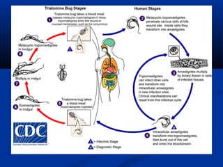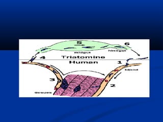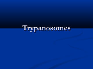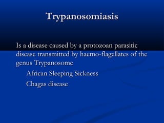 Trypanosomiasis is caused by protozoan parasites of the genus Trypanosoma and transmitted via blood-sucking insects. It manifests as either African sleeping sickness or Chagas disease. African sleeping sickness is caused by T. b. gambiense or T. b. rhodesiense transmitted by tsetse flies, while Chagas disease is caused by T. cruzi transmitted by reduviid bugs. The diseases present with fever, headaches, and other nonspecific symptoms, progressing in African sleeping sickness to mental dullness and sleepiness. Diagnosis involves identifying the parasites in blood or tissue samples or through serological tests.
