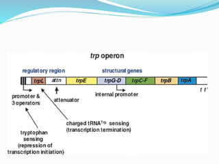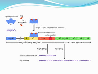 The trp operon in E. coli bacteria encodes genes for the biosynthesis of the amino acid tryptophan. It is regulated by the trp repressor protein - when tryptophan levels are low, the repressor does not bind to the operator, allowing transcription of the operon; when tryptophan levels are high, it binds to the operator and blocks transcription, turning the operon off. This allows the bacteria to efficiently control tryptophan production depending on environmental availability.