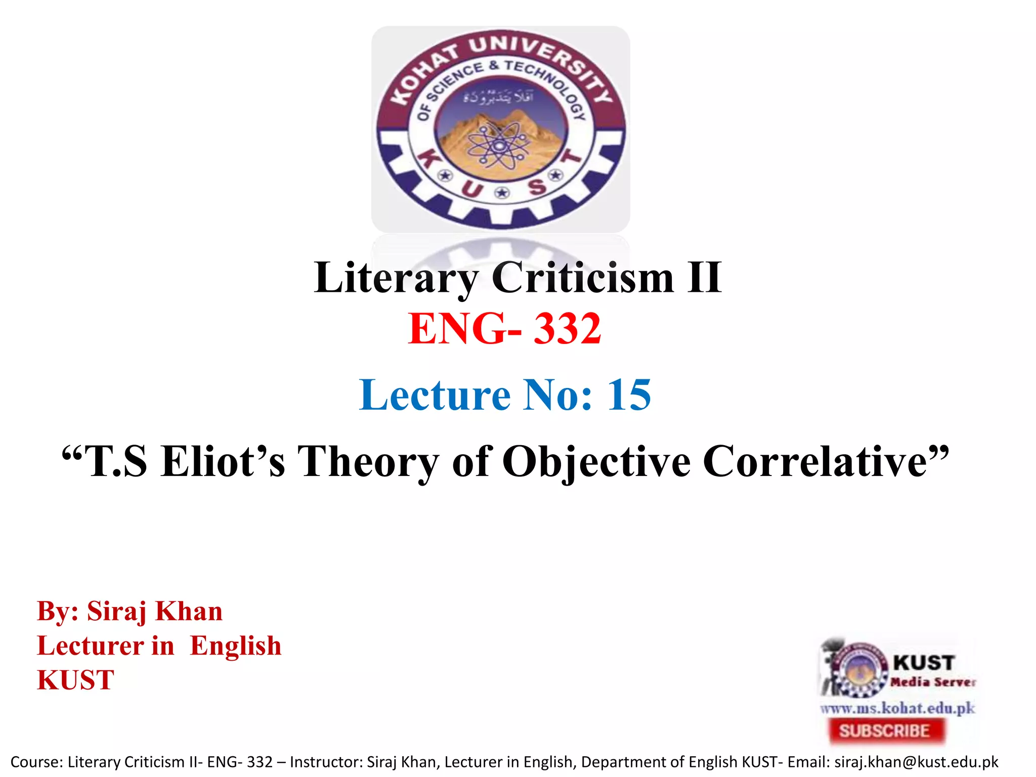 The document discusses T.S. Eliot's theory of the objective correlative. The theory holds that writers can evoke emotions in readers through a combination of objects, events, and details rather than directly stating the emotion. Eliot believed poets must find an objective correlative formula to represent emotions for readers. The document also examines Eliot's views on poetic process, tradition and criticism, and provides an example of an effective objective correlative in Macbeth.