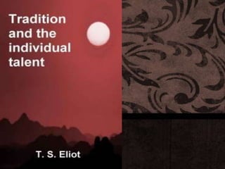 This document summarizes T.S. Eliot's essay "Tradition and the Individual Talent". It discusses Eliot's views on the importance of tradition for artists. Eliot believes the best parts of an artist's work are those most influenced by past writers and works. He also discusses his theory of impersonality in art, where the artist acts as a catalyst for experiences and impressions. The document provides an overview of Eliot's views on tradition, the individual, and depersonalization in creative works.