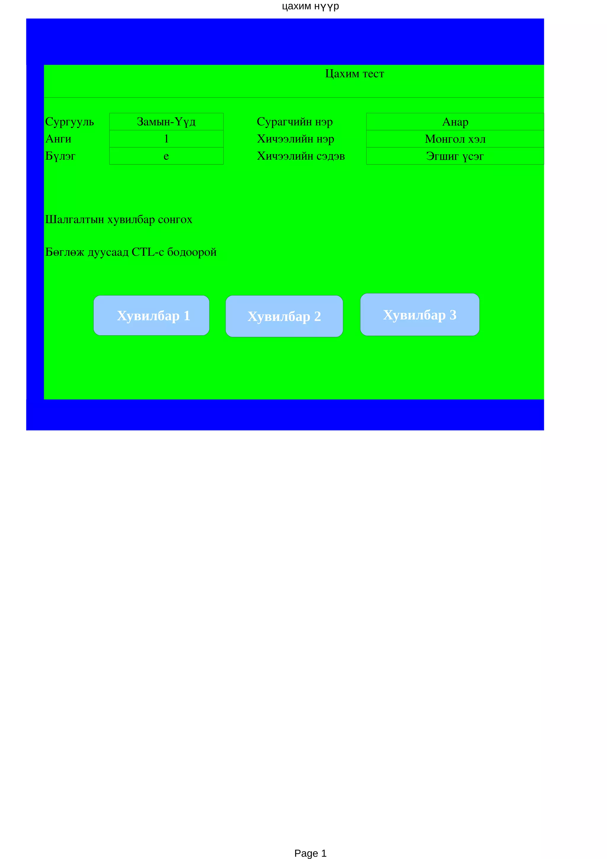 Цахим тест Сургууль ЗамынҮүд Сурагчийн нэр Анар Анги 1 Хичээлийн нэр Монгол хэл Бүлэг е Хичээлийн сэдэв Эгшиг үсэг Шалгалтын хувилбар сонгох Бөглөж дуусаад CTLс бодоорой Хувилбар 1 Хувилбар 2 Хувилбар 3 Page 1
