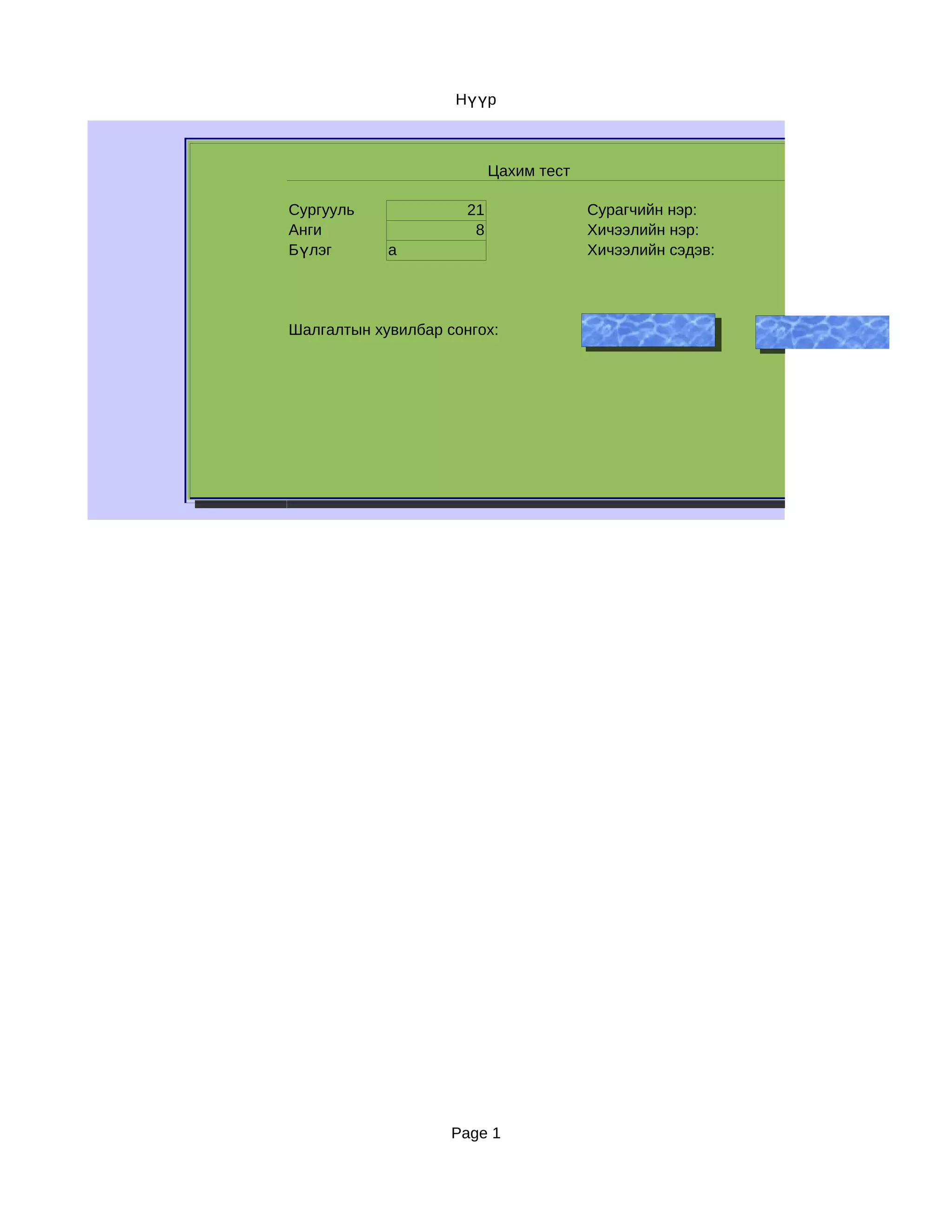 Цахим тест Сургууль 21 Сурагчийн нэр: Анги 8 Хичээлийн нэр: Бүлэг а Хичээлийн сэдэв: Шалгалтын хувилбар сонгох: Хувилбар – 1 Хувилба Page 1