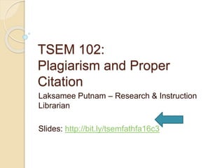This document summarizes a presentation on plagiarism and proper citation. It defines plagiarism as using someone else's ideas or words without giving them proper credit. It discusses real world examples of plagiarism and Towson University's academic integrity policy. It also covers the Chicago citation style and provides examples of how to properly cite and paraphrase sources. The presentation emphasizes the importance of citing sources to avoid plagiarism and support arguments. It provides resources for citing sources in Chicago style.