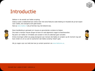 Introductie Welkom inde wereld van habbo scripting. Zoals je weet is habbohotel een online chat met extra features zoals kleding en meubels die je kan kopen voor credits, die overigens echt geld kosten. Kijk op www.habbo.nl als je hiermee nog niet bekend was. Deze handleiding is gemaakt om nieuwe en gevorderden scripters te helpen. Ons doel is mensen nieuwe dingen te leren en veel algemene vragen te beantwoorden. Na jaren van habbo en inmiddels ook scripten is het ons allemaal gaan vervelen. Al die ervaringen willen we graag doorgeven aan mensen die habbo en scripten op dit moment nog wél leuk vinden en om zo ook te voorkomen dat habbo scripting “dood” gaat. Als je vragen voor ons hebt dan kan je contact opnemen via www.leetzone.us .