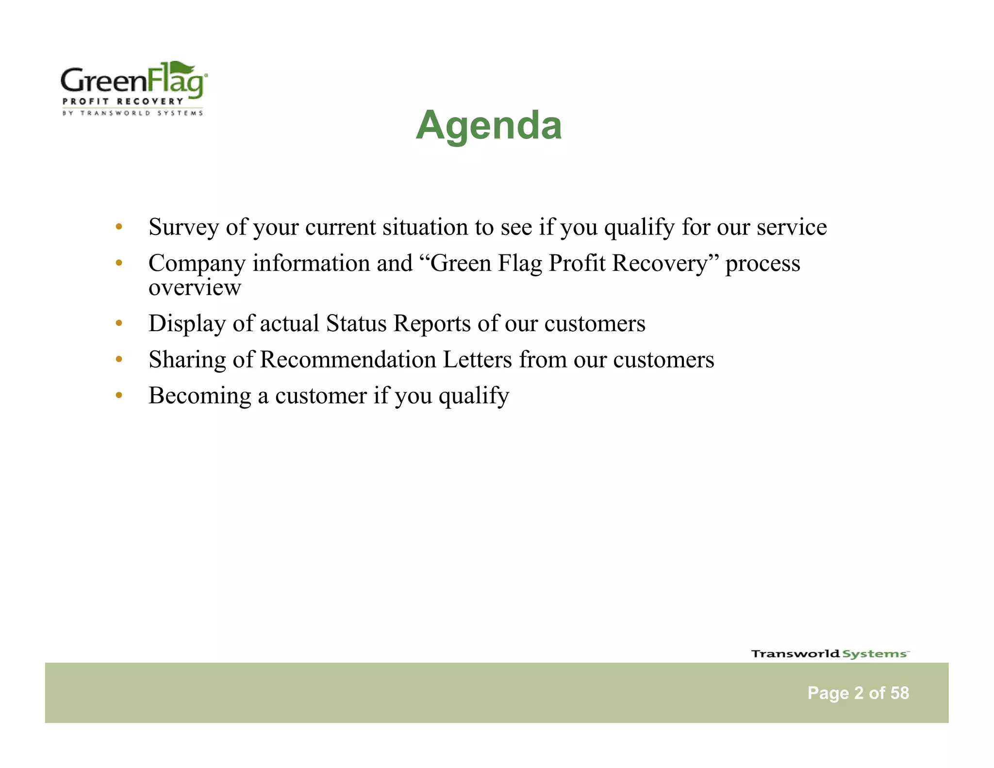 The document provides an overview of T.S.I.'s accounts receivable recovery services. It outlines T.S.I.'s 3-phase collection process, which begins with a client's in-house efforts and transitions eligible past due accounts to T.S.I.'s recovery process before possible legal action. It highlights T.S.I.'s large client base, recovery rates significantly higher than industry averages, and low fees that provide savings over traditional agencies. The document is intended to demonstrate for prospective clients how T.S.I.'s middle-step process can improve their cash flow and reduce expenses compared to solely using in-house or outside collection agencies.