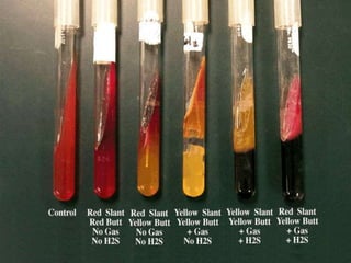 The TSI test is used to determine carbohydrate fermentation and hydrogen sulfide production in bacteria. It contains glucose, sucrose, and lactose sugars, along with peptones and phenol red pH indicator. Carbohydrate fermentation produces acid, changing the color from red to yellow, while peptone metabolism makes it more alkaline. Hydrogen sulfide production is shown by black precipitate. Results are interpreted based on color changes in the slant and butt portions, indicating which sugars are fermented and if H2S is produced.