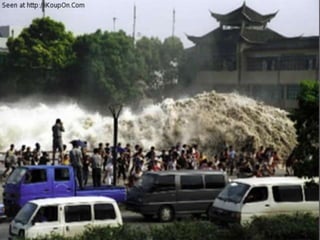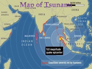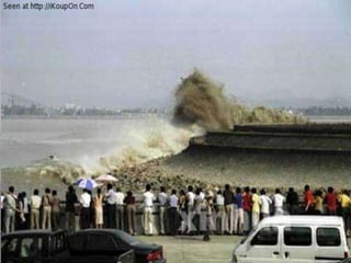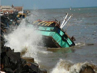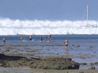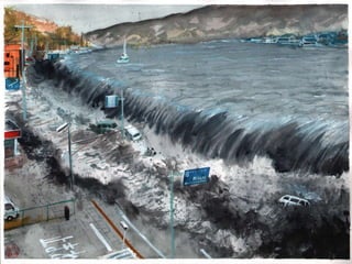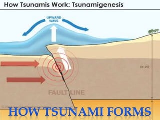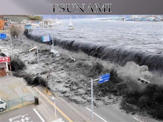 A tsunami is a series of water waves caused by the displacement of a large volume of water, often from earthquakes, volcanic eruptions, landslides or other disturbances below or above water. Tsunami waves have a very long wavelength and can cause enormous destruction in coastal areas, with wave heights over tens of metres. The 2004 Indian Ocean tsunami was one of the deadliest natural disasters, killing over 290,000 people across 14 countries.