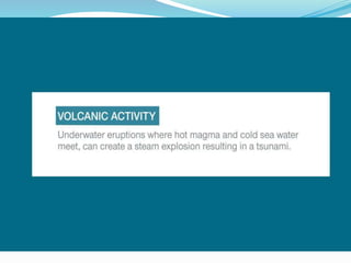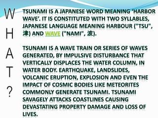 The document discusses tsunamis, their causes, effects, and history. Tsunamis are caused by underwater earthquakes, volcanic eruptions, landslides, or meteor impacts displacing large volumes of water. They have struck coastlines throughout history, including the 2004 Indian Ocean tsunami that killed over 118,000 people across several countries. Early warning systems and evacuation to higher ground can help reduce loss of life from future tsunamis.