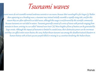A tsunami is a series of waves caused by the displacement of a large volume of water, usually in an ocean or large lake. Earthquakes, volcanic eruptions, landslides, meteorite impacts, and other disturbances above or below water all have the potential to generate a tsunami. Tsunamis consist of a series of waves that can range from minutes to hours, with wave heights reaching tens of meters that can cause enormous destruction over entire ocean basins.