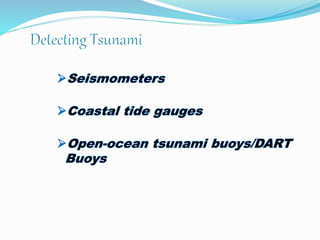 The document describes a tsunami warning system, explaining that tsunamis are large ocean waves usually caused by undersea earthquakes, volcanic eruptions, or landslides. The system uses seismometers to detect earthquakes, tide gauges to measure changes in sea level, and NOAA and DART stations that can detect tsunamis, allowing warnings to be issued to protect coastal areas from potential damage from an approaching tsunami.