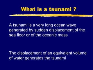 A tsunami is a very long ocean wave generated by sudden displacement of the sea floor or ocean mass. Tsunamis can hit with little or no warning in areas prone to earthquakes and volcanoes. In deep water, tsunamis travel very quickly but slow down and pile up in shallow water, increasing their amplitude and hazards. Mitigation requires emergency planning, public education, and disseminating warning information so people can evacuate to higher ground quickly when alerts occur.
