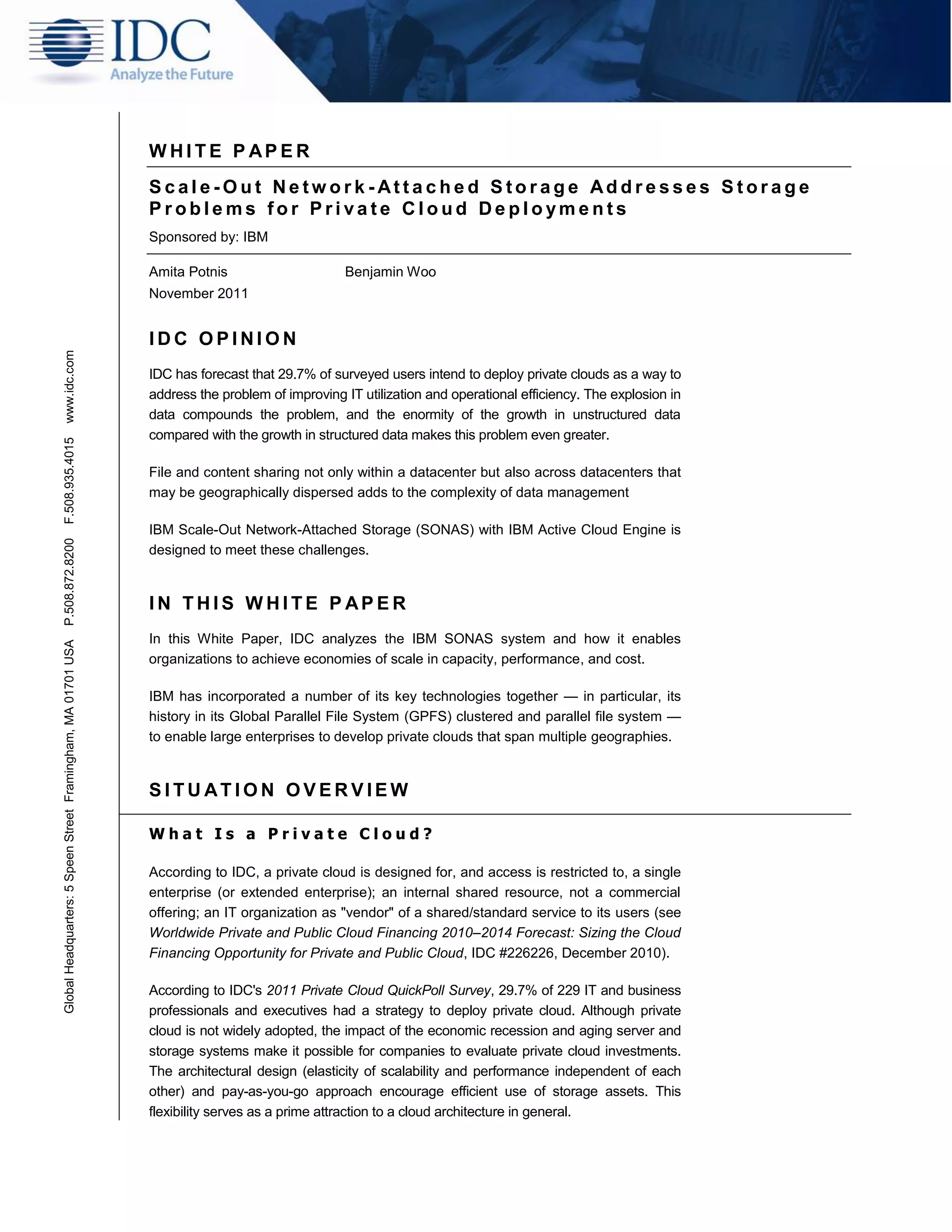 This document discusses how private cloud deployments are addressing growing storage problems through the use of scale-out network attached storage solutions like IBM's SONAS. It outlines key challenges organizations face with exponential data growth and the need for scalability, efficiency, disaster recovery and information governance. Scale-out file-based storage is presented as a way to meet these challenges by providing flexible scalability of performance and capacity independent of each other across multiple servers.