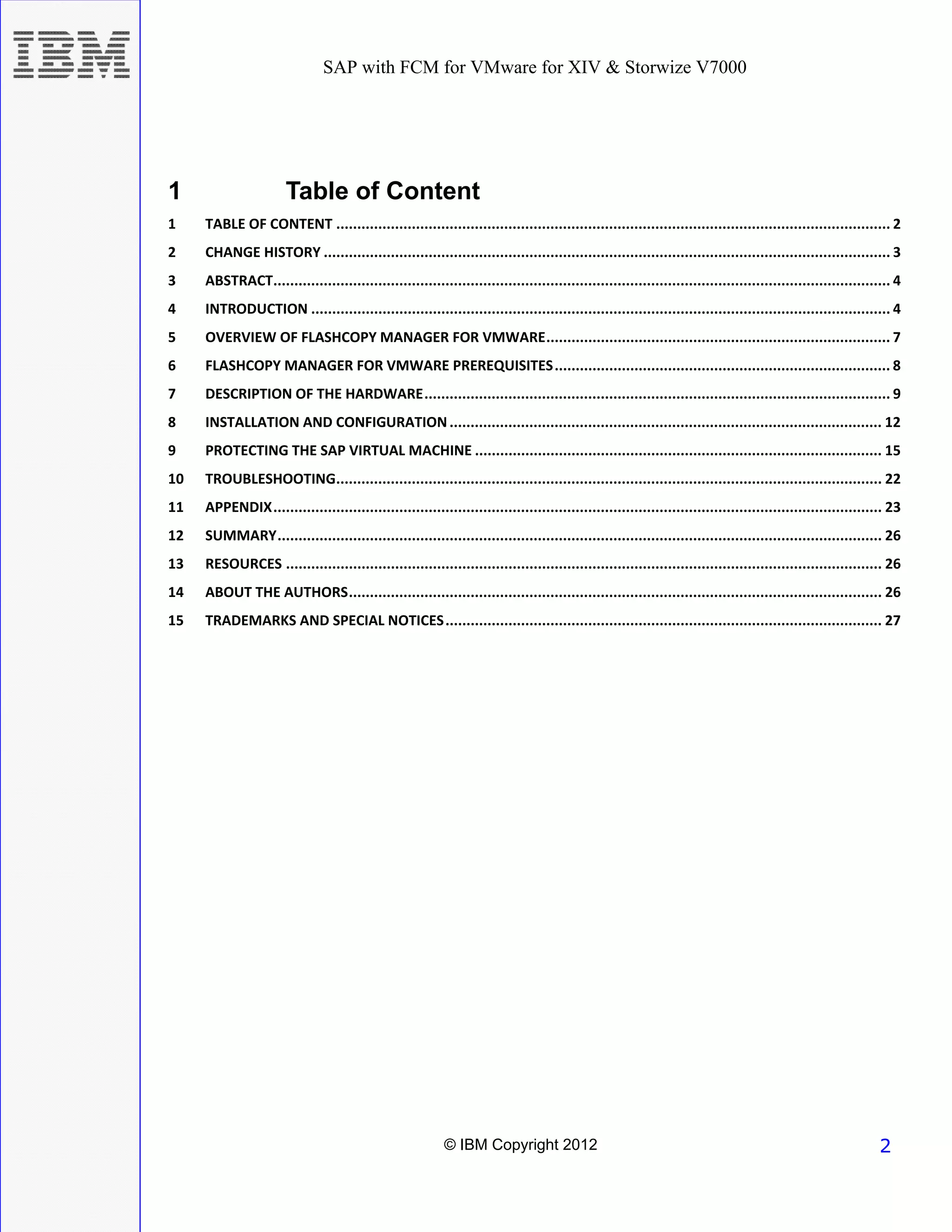 This document provides instructions for installing and configuring IBM FlashCopy Manager for VMware to backup two SAP virtual machines using IBM XIV and Storwize V7000 storage systems. It describes installing FlashCopy Manager on a Linux server, setting up the required storage array interfaces, and creating protection jobs through the vCenter plug-in to take application-consistent snapshots of the SAP VMs for backup purposes with minimal downtime.