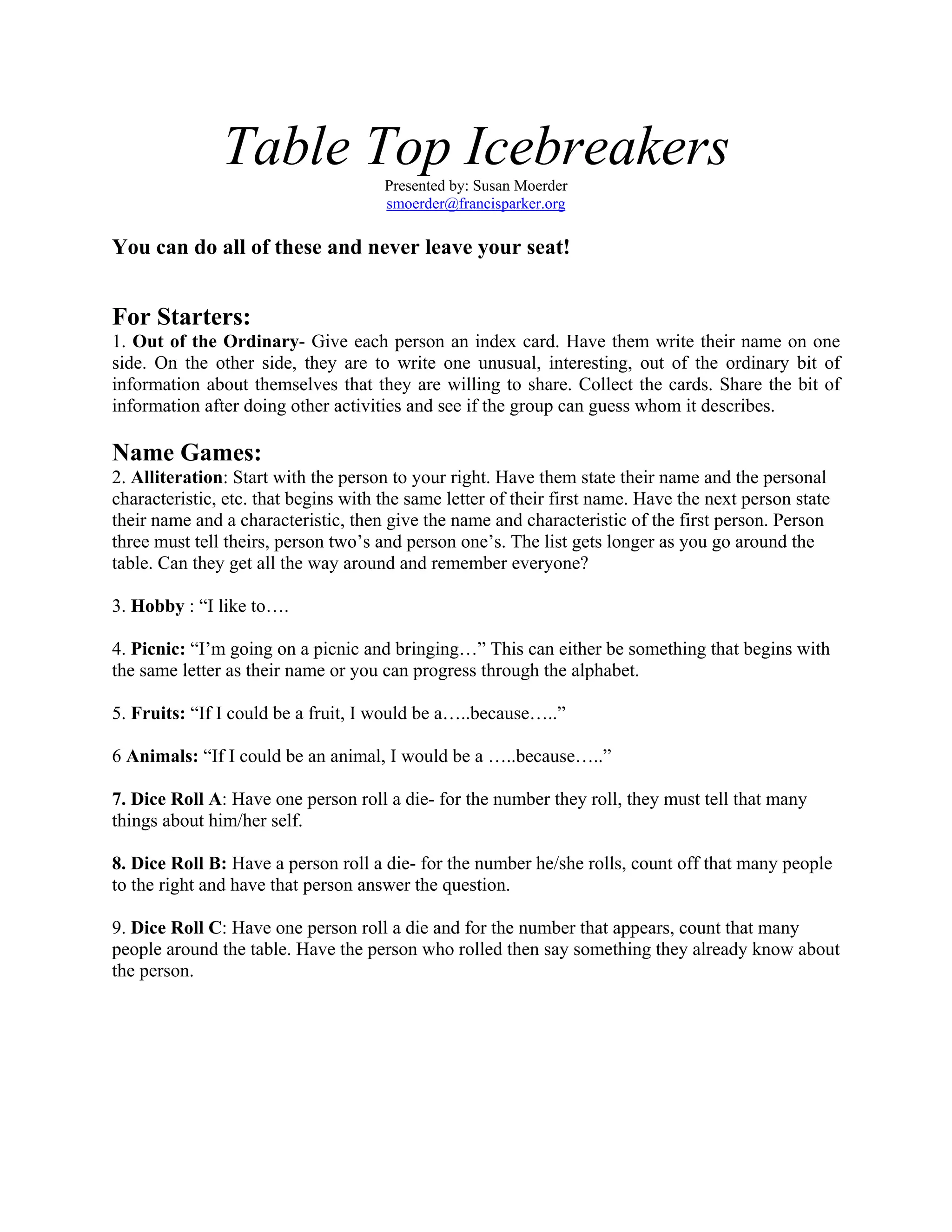 The document provides 30 icebreaker activities that can be done while seated. The activities include having participants write unusual facts about themselves on index cards to be guessed, name games involving alliteration or objects they bring on a picnic, partner activities like building towers out of straws or thumb wrestling, and group activities like guessing lies among truths or passing around candy and stating facts about oneself for each piece taken. The icebreakers are intended to help participants learn each other's names and share personal details to build rapport within a group.
