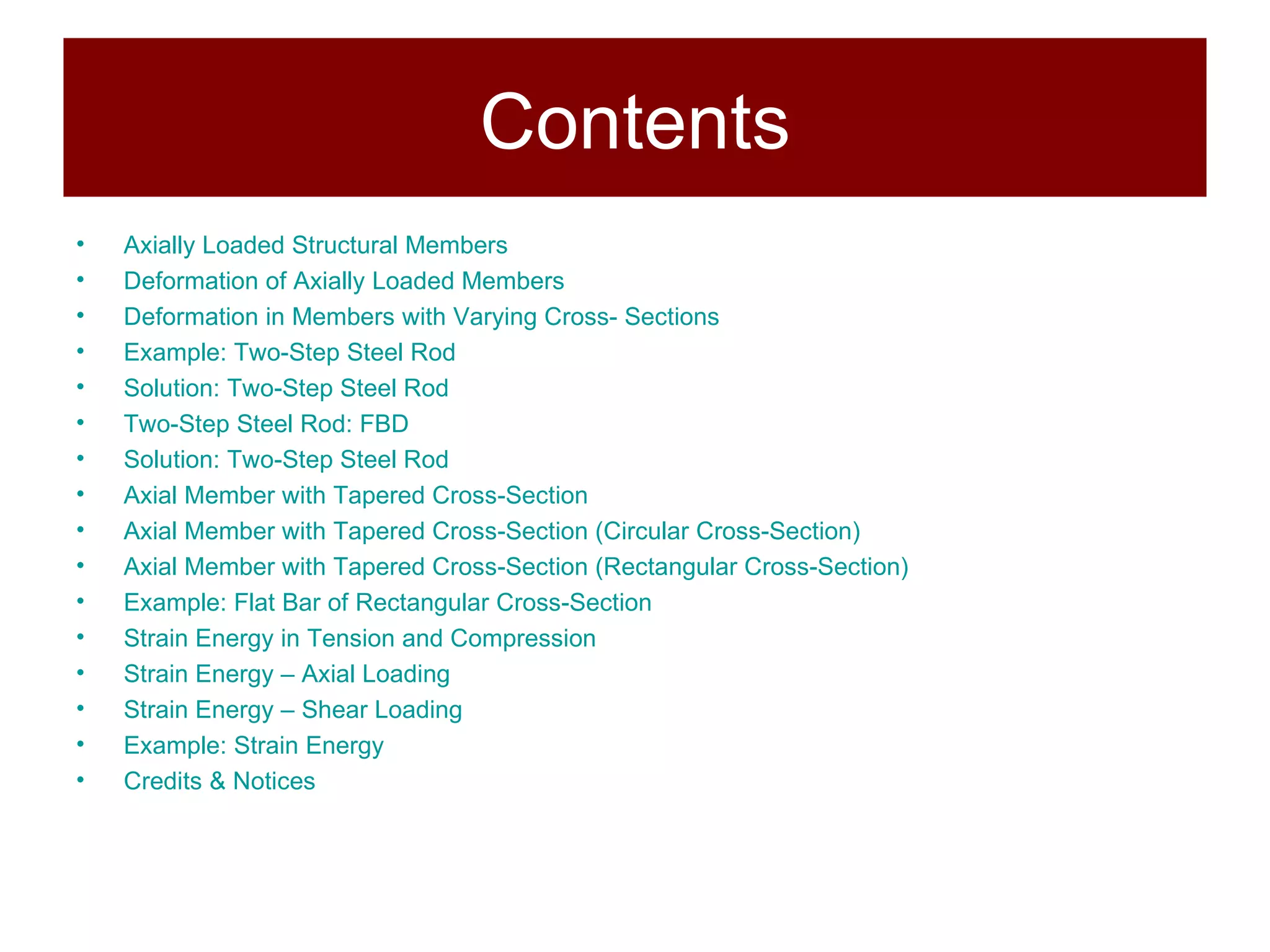 This document discusses the analysis of axially loaded structural members, focusing on the deformation of stepped and tapered rods under tension, and introduces the concept of strain energy. It includes mathematical equations for calculating elongation and strain energy in members with varying cross-sections and provides examples with detailed solutions. The document is part of educational material from Loughborough University, emphasizing the mechanics of materials under axial loads.