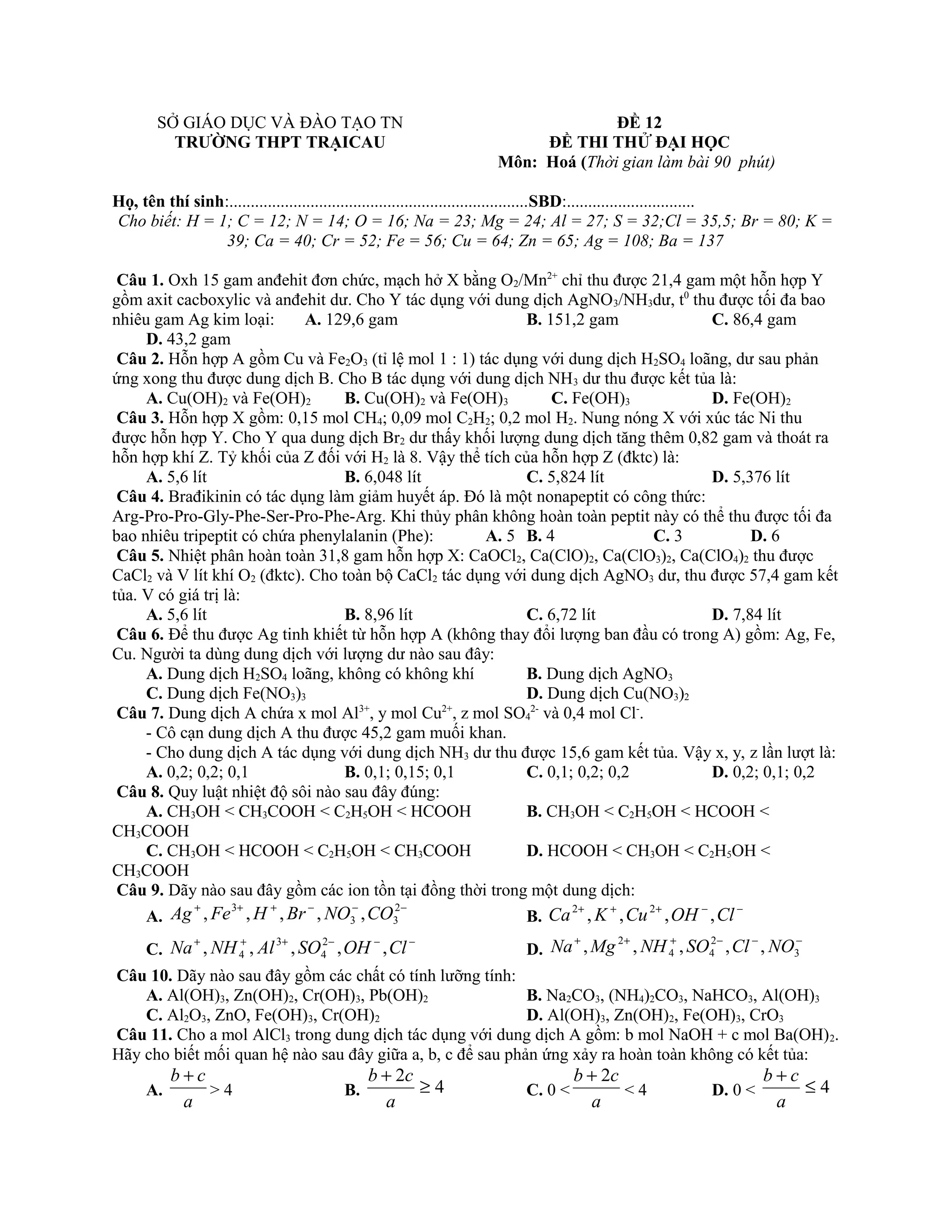 Tài liệu là một đề thi thử đại học môn Hóa học với nhiều câu hỏi liên quan đến hóa học vô cơ, hữu cơ và lý thuyết hóa học. Các câu hỏi kiểm tra kiến thức về phản ứng hóa học, cấu trúc phân tử, và đặc điểm các chất hóa học. Nội dung đề thi bao gồm 34 câu hỏi với nhiều hình thức khác nhau từ tính toán, lý thuyết đến ứng dụng thực tiễn.