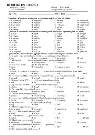 This document appears to be a practice test for a Vietnamese university entrance exam. It contains 7 sections testing English language skills like vocabulary, grammar, reading comprehension and sentence rewriting. Section 1 asks test takers to identify words with different stress patterns. Section 2 focuses on pronunciation of underlined parts of words. Sections 3-5 contain multiple choice questions testing vocabulary, grammar and reading comprehension. Sections 6-7 involve rewriting sentences and completing sentences with given words. The test aims to evaluate a candidate's English proficiency in various areas important for university study.