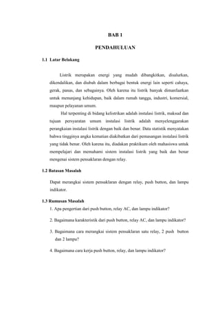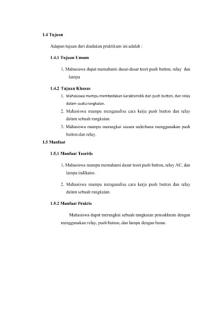 Dokumen tersebut membahas tentang rangkaian push button, relay, dan lampu indikator. Rangkaian tersebut digunakan untuk mengontrol keadaan on, off, dan standby menggunakan relay, push button, dan lampu indikator sebagai penanda keadaan.