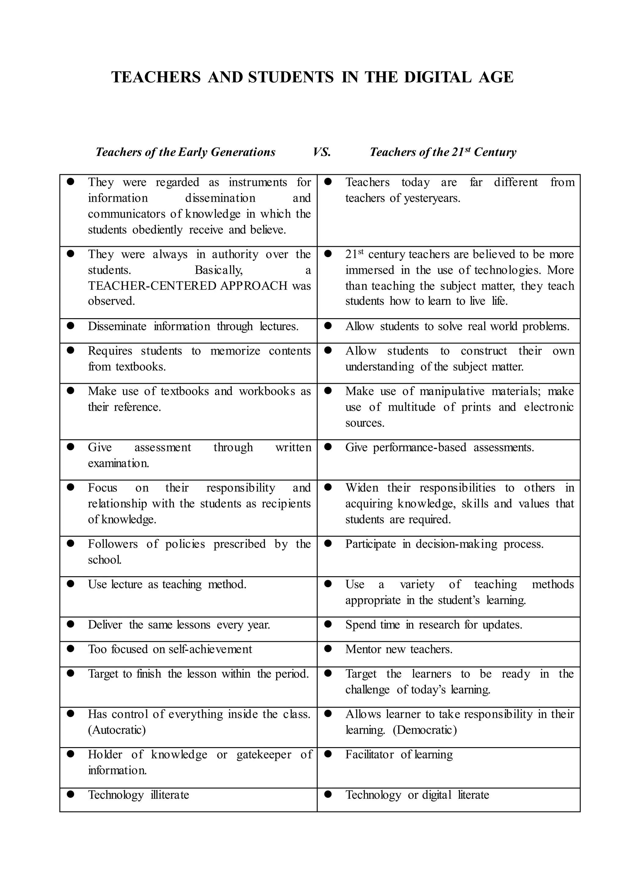 The document compares teachers and instruction methods of the early generations to those of the 21st century. In the early generations, teachers disseminated information through lectures and students memorized content passively. Now, teachers facilitate active, student-centered learning through varied methods like interactive lectures, case-based learning, and problem-based learning. Students construct their own understanding and solve real-world problems collaboratively using technology to access information. The challenges for 21st century teachers are to utilize technology to enhance authentic, quality learning opportunities for students.