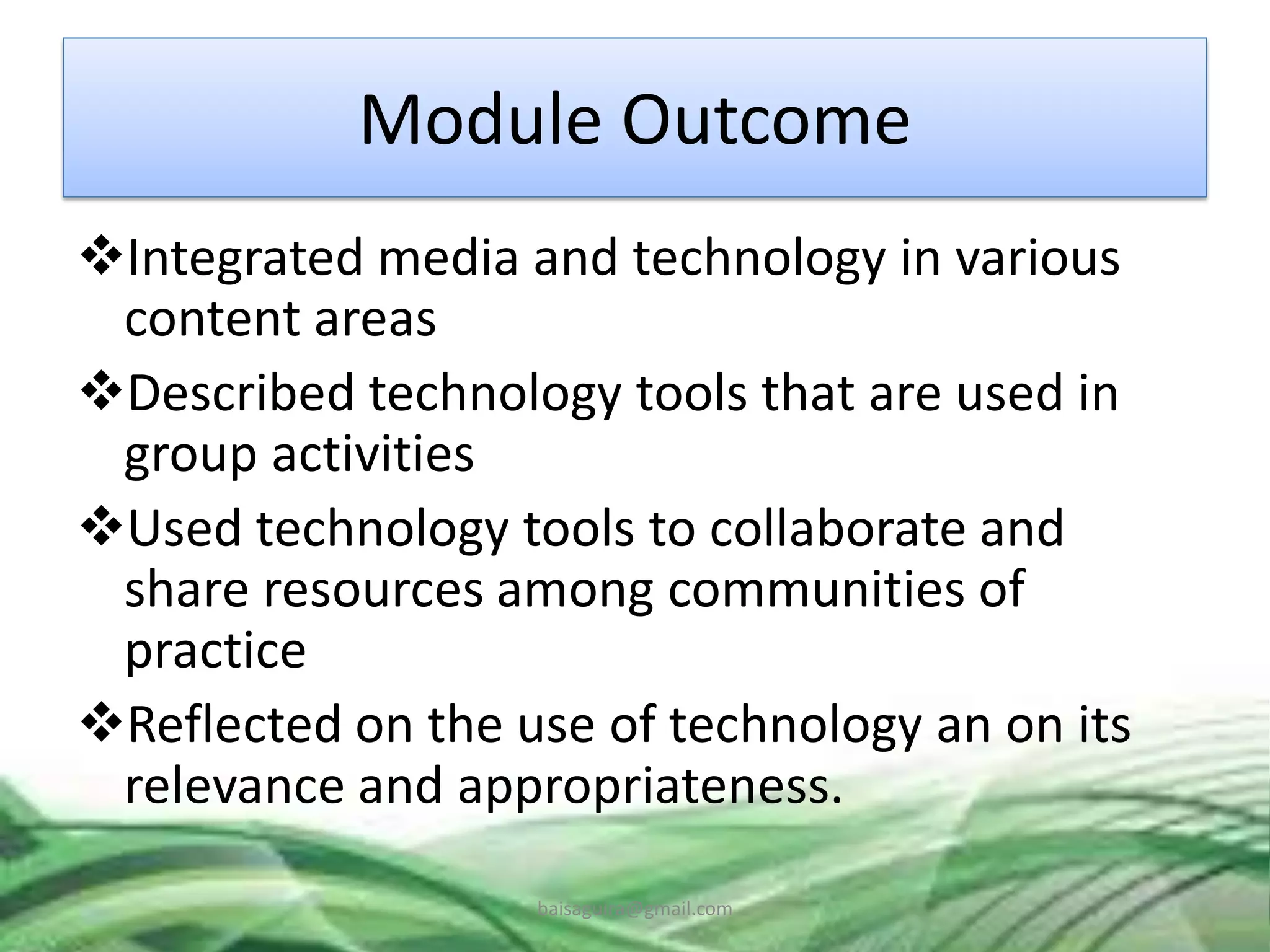 The document discusses the significance of instructional materials in teaching and learning, highlighting their roles in enhancing communication, retention, and access to information. It outlines procedures for developing effective instructional materials, including consideration of resources and adaptation of existing materials. Additionally, it provides practical suggestions for using various low-cost teaching aids, such as writing boards and flip charts.