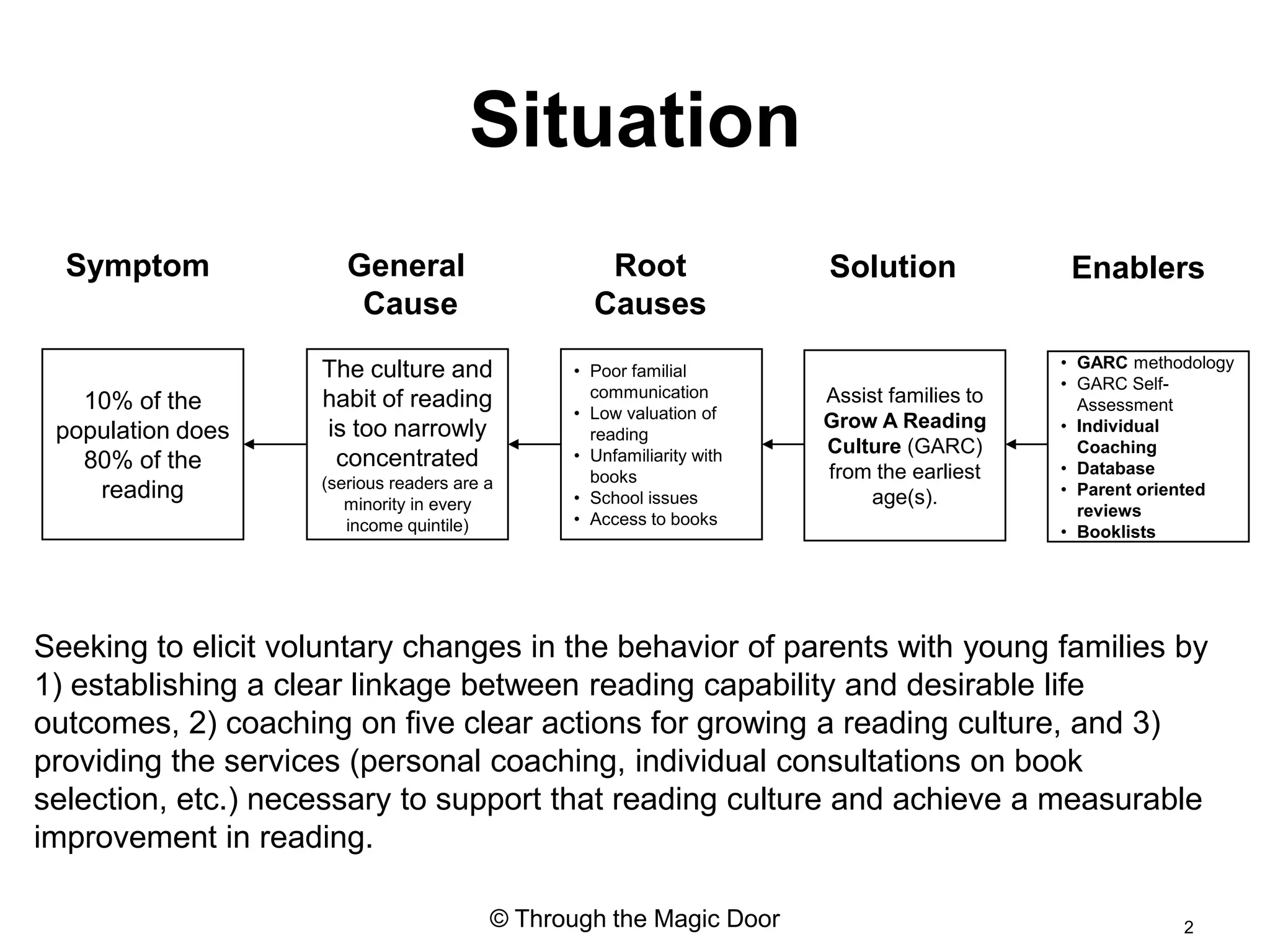 Through the Magic Door seeks to address low reading rates by growing a reading culture from an early age. It analyzes root causes like poor family communication and low valuation of reading. Its solution assists families through the Grow a Reading Culture methodology, coaching, and resources. It aims to establish clear links between reading and life outcomes to motivate voluntary behavior changes in parents of young families.