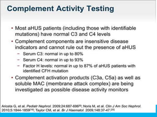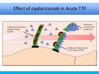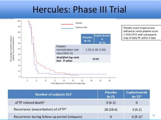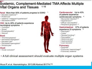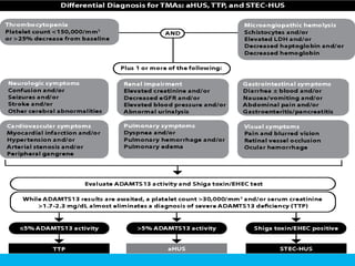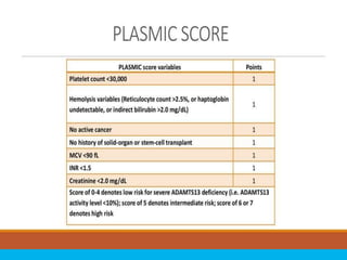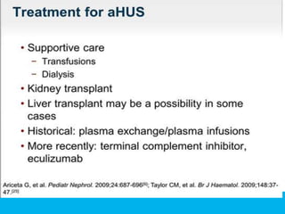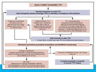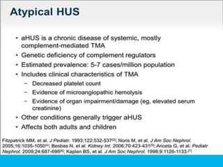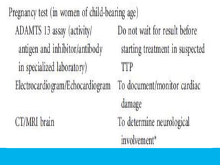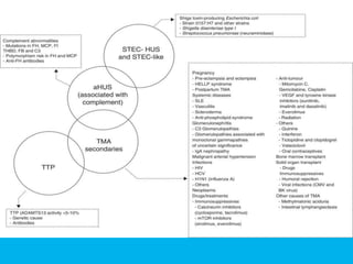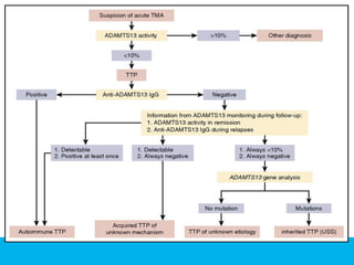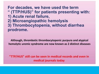 The document discusses thrombotic thrombocytopenic purpura (TTP) and atypical hemolytic uremic syndrome (HUS) as distinct diseases, highlighting epidemiology, diagnosis, and types of TTP. It emphasizes the mortality rates associated with TTP and the classic symptoms such as microangiopathic hemolytic anemia and thrombocytopenia. Finally, it advocates for the discontinuation of the combined term 'TTP/HUS' in medical terminology.