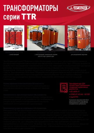 Трансформаторы серии TTR от компании S.E.A. SPA являются сухими и литого типа, предлагая альтернативу традиционным масляным трансформаторам с высоким уровнем безопасности и минимальными требованиями к обслуживанию. Их применение особенно актуально в ответственных областях, таких как больницы и промышленные предприятия, благодаря самогасящимся материалам и сокращенной необходимости в техническом обслуживании. Компания предлагает широкий ассортимент моделей и гарантирует соответствие международным стандартам и требованиям клиентов.