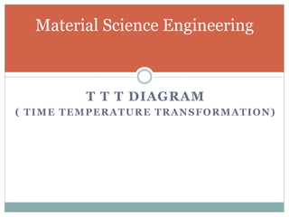 The document discusses time-temperature-transformation (TTT) diagrams, which show the kinetics of isothermal transformations in steel alloys. TTT diagrams plot temperature versus the logarithm of time and indicate when specific transformations start and end. They show that austenite is stable above the lower critical temperature but unstable below it. Depending on the cooling rate, austenite can transform into pearlite, bainite, or martensite. Slow cooling leads to full pearlite transformation, while very fast cooling results in full martensite formation. TTT diagrams provide information about transformation rates, temperatures, phases, and microstructure sizes.