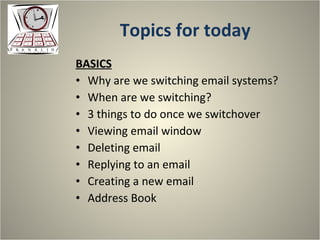 This document provides an overview and introduction to switching the school's email system from GroupWise to Outlook Web Access over the summer. It outlines the key topics covered which include the reasons for switching, timeline, and three important things to do once switched over. Instructions are then provided on how to log in to the new system, change passwords, add a signature, and enter contact information. The email interface and functions like viewing, deleting, replying and creating new messages are also explained.