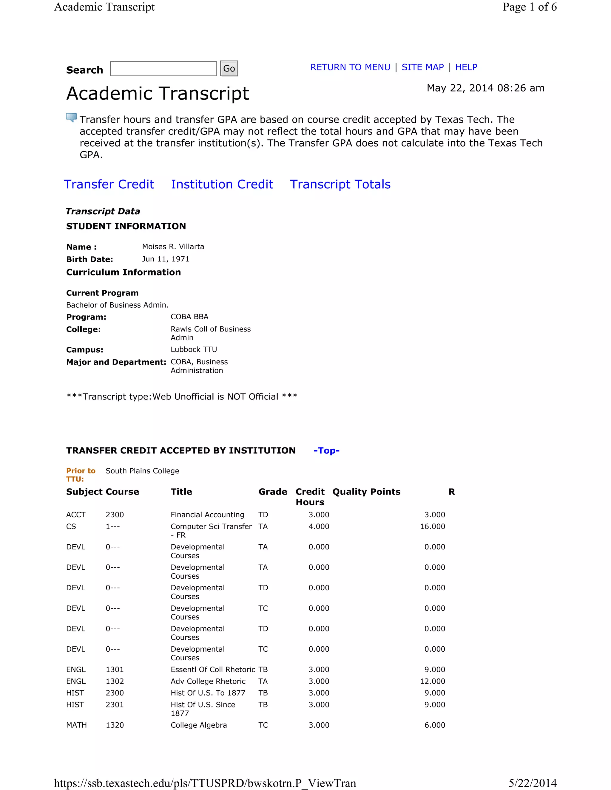 - Transfer credit hours and GPA from multiple institutions including South Plains College, De Ocampo Memorial College, and AMA Computer College that were accepted by Texas Tech University.