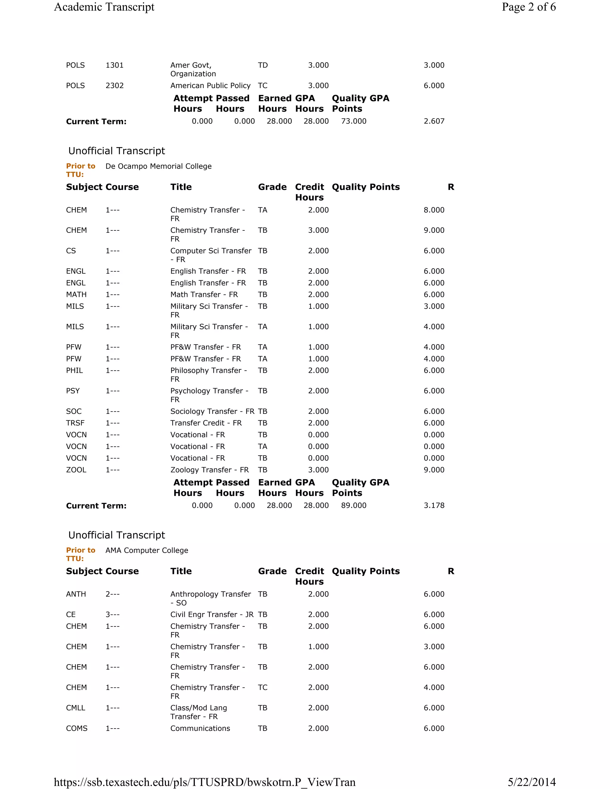 - Totals for transfer credit hours, grades, and GPA as well as totals for Texas Tech coursework and overall academic record.