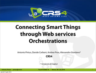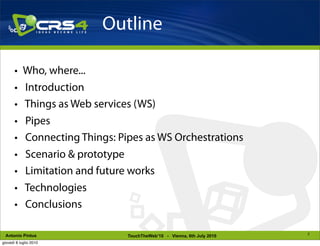 The document discusses connecting everyday objects as web services within a Web of Things (WoT) framework, emphasizing the role of users in programming and composing applications. It introduces the concept of 'pipes' for orchestrating interactions between these web services and presents a prototype built on a smartphone app for user interaction. The paper highlights limitations and future work, including improving automatic pipe matching and exploring additional service types.